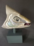 2019Zilver kleurige keramieken vis op een grijze sokkel.