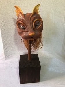 2018Met oxides gestookte bruine leeuwenkop met kokosmanen op houten op een staaf in een houten sokkel.